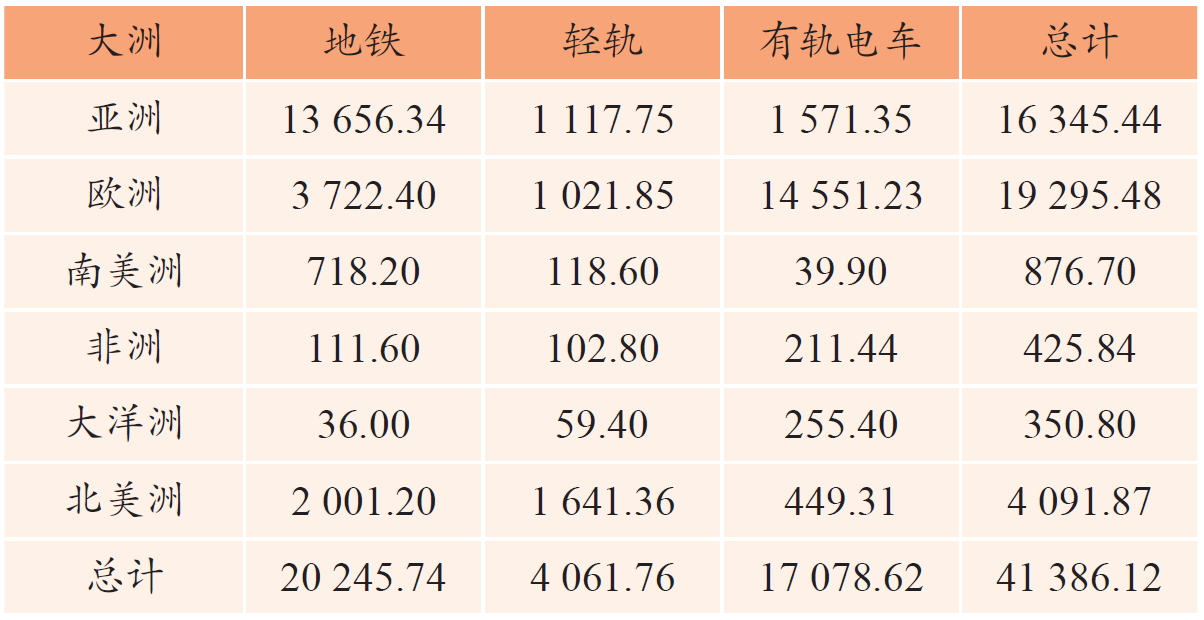 図 1 は、世界の主要大陸にわたる都市鉄道交通の全体規模を示しています (注: ロシアのすべての都市は計算のためにヨーロッパに分類されています)。データによると、世界的に地下鉄と路面電車が都市鉄道交通の主流のタイプであり、世界の都市鉄道交通は主にユーラシアに集中しており、地下鉄は主にアジア諸国に分布しています[1]。