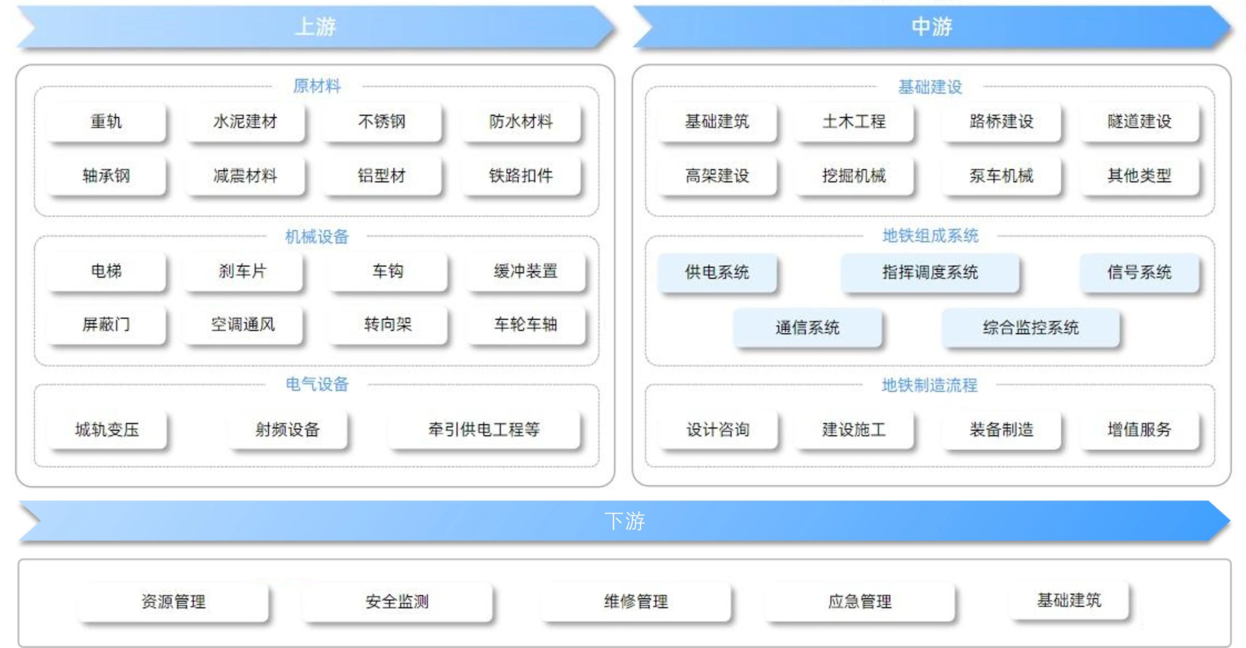 鉄道輸送は都市産業を結び、産業チェーンの拡張を促進し、機器製造や技術研究開発などの裾野産業の急速な発展を促進します。地下鉄産業チェーンは図 3 に示されており、すべてのリンクが相互依存しており、都市集積と大都市圏の経済発展を推進しています。[2]