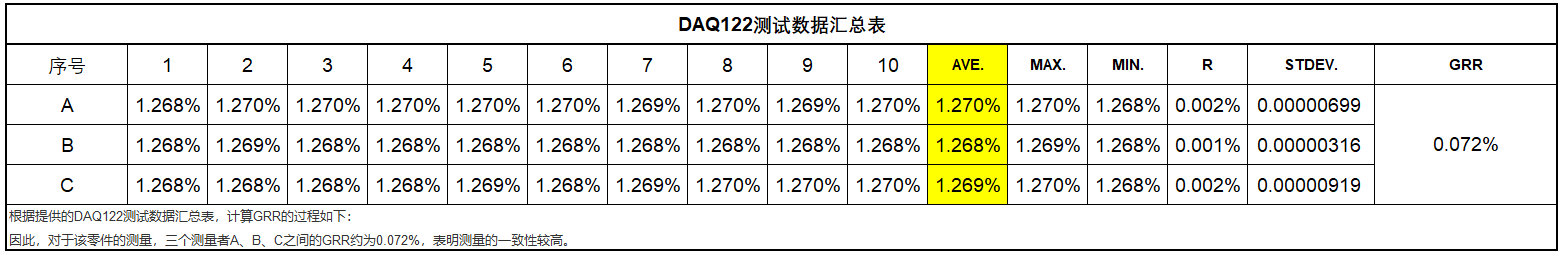 選択したデータ収集カードが要件を満たしていることを確認するために、ME チームはそれをテストしました。分析の結果、選択したデータ収集カードは優れた安定性を備えており、3 人の測定者 A、B、C の間で GRR が約 0.072% であることがわかりました。