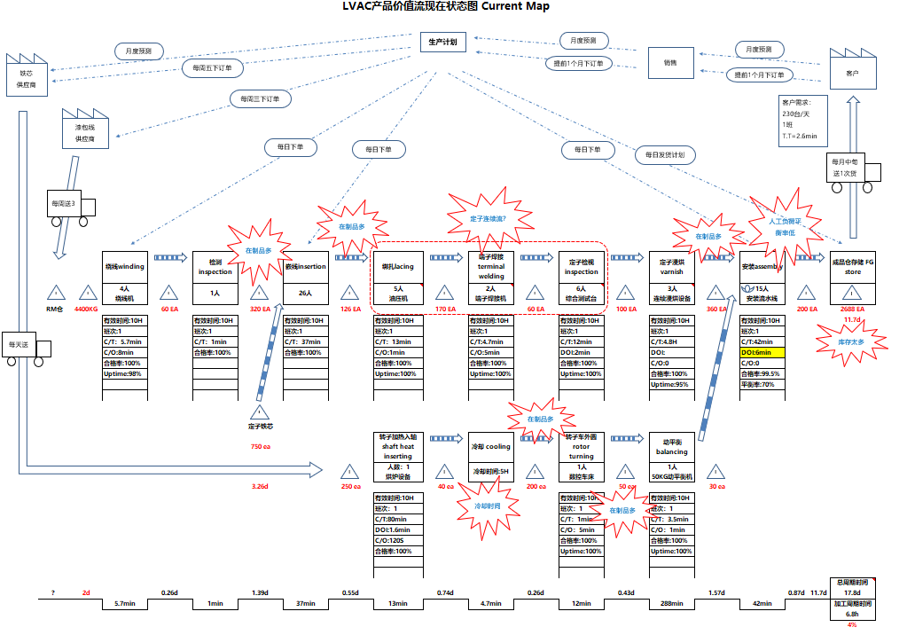 全スタッフを対象とした包括的な無駄のないトレーニングの後、日本電産 KDS エレベーター モーターの運用チームは、製造プロセスの改善を開始するためのコア ツールとして VSM (バリュー ストリーム マッピング) を採用しました。 「VSM」(バリュー ストリーム マッピング)は、生産における無駄を特定して削減するように設計されており、フレームワークベースの考え方を確立し、その後の改善に向けた明確な行動の方向性を確立するのに役立ちます。