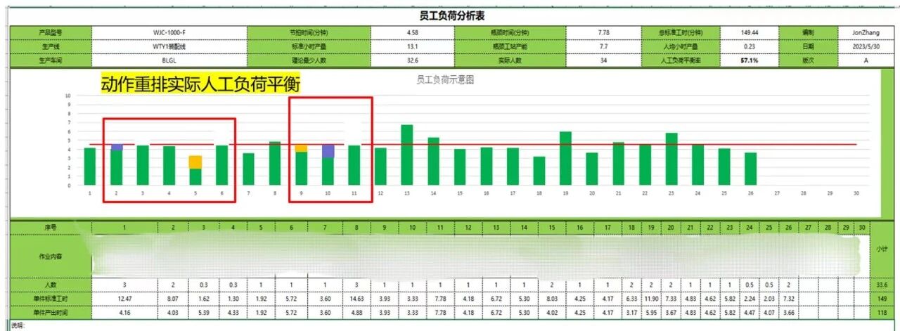 従業員の仕事量率は、能力向上の基本的な要素です。プロセス間のサイクルタイムが一貫していないため、実際の生産量は比較的低かったです。これまでのラインバランス改善の経験を活かし、ME部門が中心となり、生産ライン従業員の負荷分散率向上に向けた取り組みを推進しました。 ECRS 原則 (削除、結合、再配置、簡素化) を適用してプロセスを最適化することにより、従業員のワークロード バランス率は 82% 以上に達しました。
