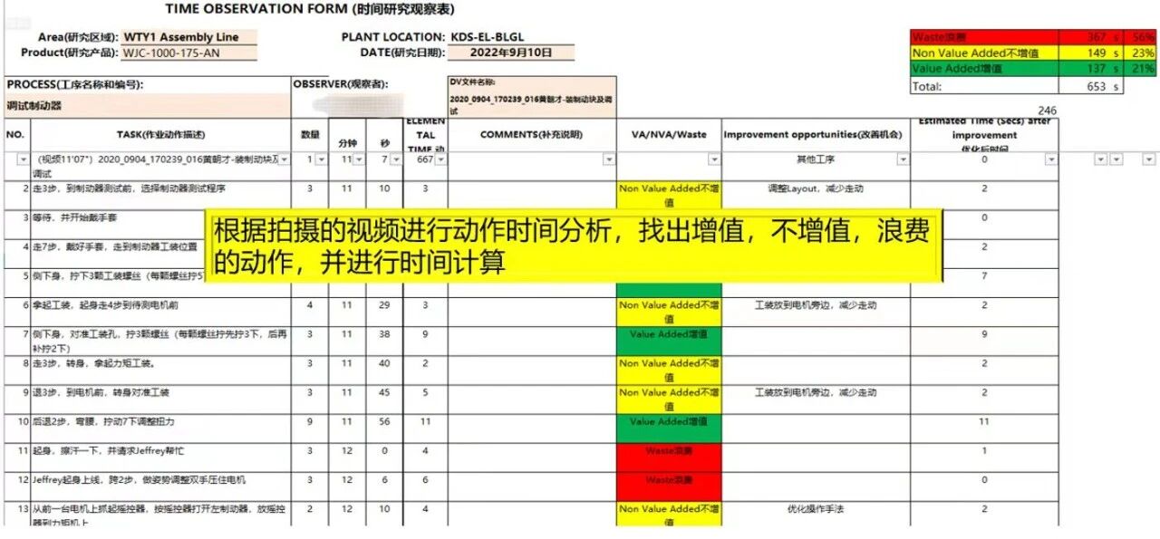 時間分析は社内で最も早く導入された体系的な改善ツールとして、確かな改善経験を蓄積してきました。また、これは、VSM 全体の改善活動において先駆的な役割を果たし、以前の改善の継続と、その後のプロジェクト固有の改善へのリンクの両方として機能しました。改善チームは、標準労働時間の原則に従って各工程で従業員の作業を撮影する専任担当者を割り当てました。チームメンバーと現場の従業員が共同でビデオを繰り返し確認し、作業の動きを分解して分析し、集合的なブレインストーミングを実施して改善機会の特定と提案を行い、最終的に改善計画を策定しました。