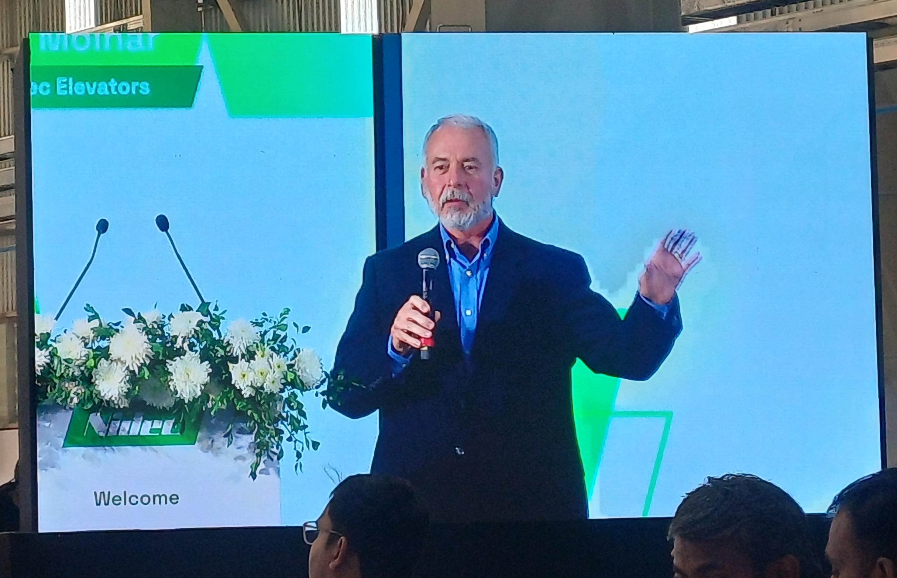 図8 式典で挨拶する日本電産エレベータ副社長 デビッド・モルナー氏